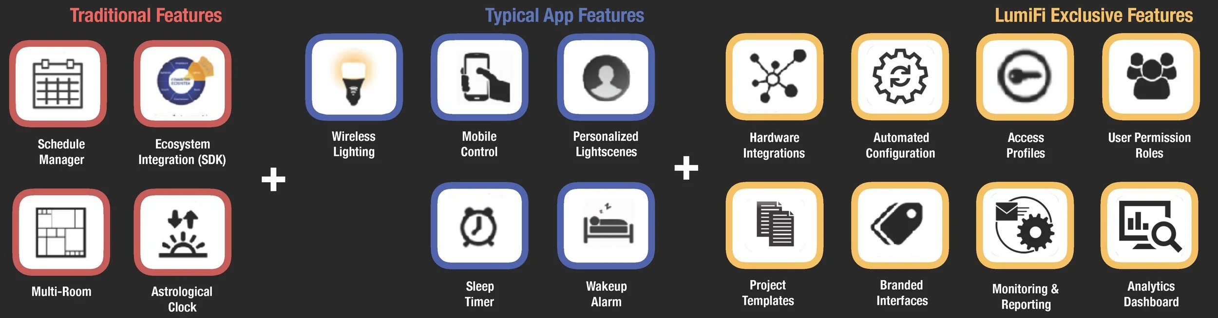 LumiFi integrates with various third party IoT-enabled lighting hardware manufacturers, across multiple wireless protocols that are offering an API for seamless integration into one comphrehensive user experience.